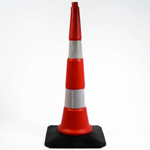 Dvodelni saobraćajni čunj visine 90 cm izrađen je od kombinacije HDPE plastike i masivne gumene baze, što obezbeđuje izuzetnu stabilnost i otpornost čak i pri jačem vetru ili prolasku vozila. Na sebi ima reflektujuće trake, koje omogućavaju odličnu vidljivost danju i noću i značajno povećavaju bezbednost na terenu.